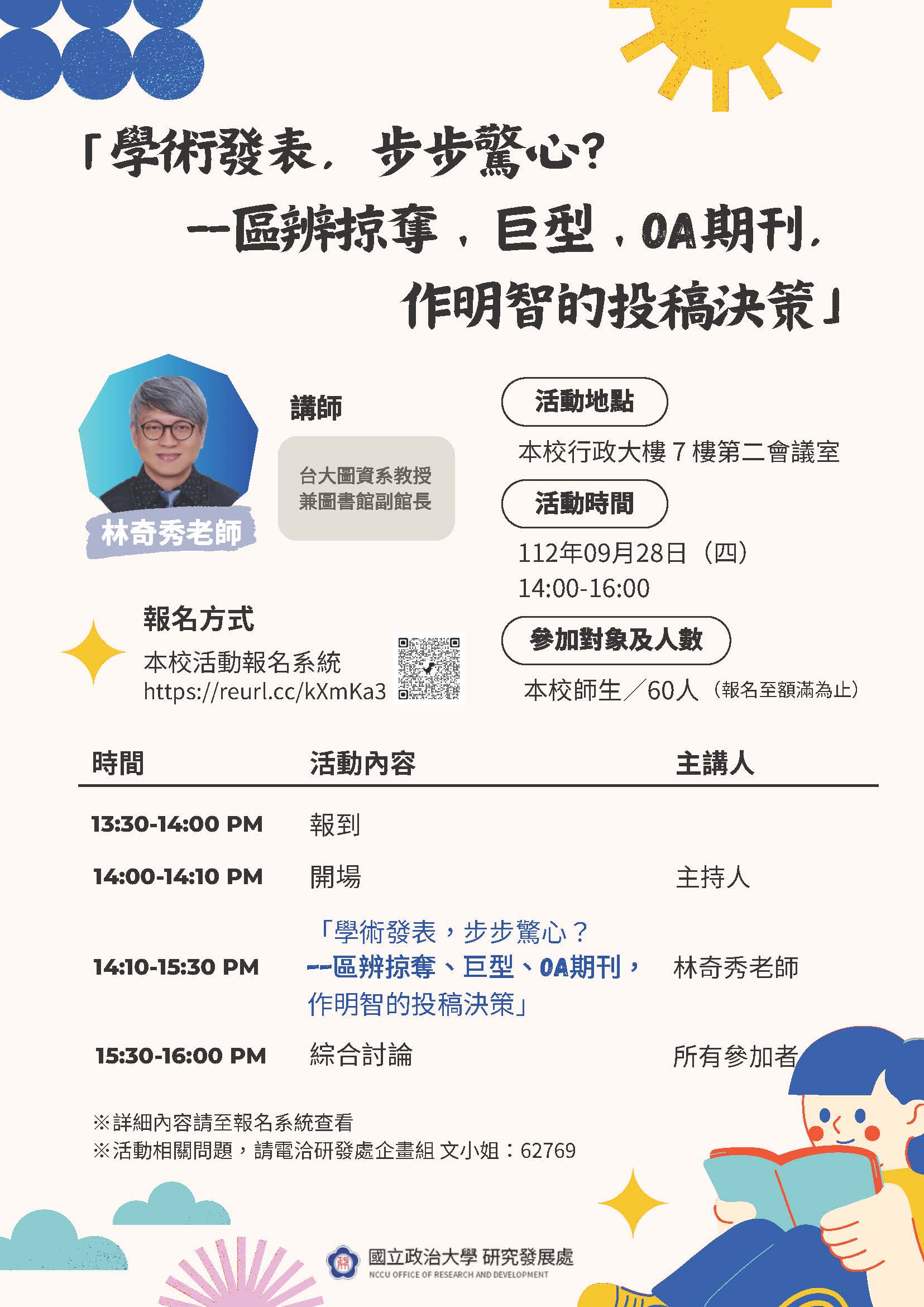【演講公告】「學術發表,步步驚心?--區辨掠奪、巨型、OA期刊,作明智的投稿決策」工作坊