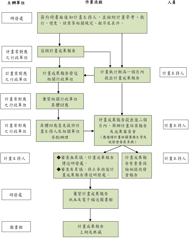 - 計畫成果報告提出後二個月內協調計畫主持人舉辦計畫結案報告及成果審查會,邀請相關業務主管及校發會委員參與。